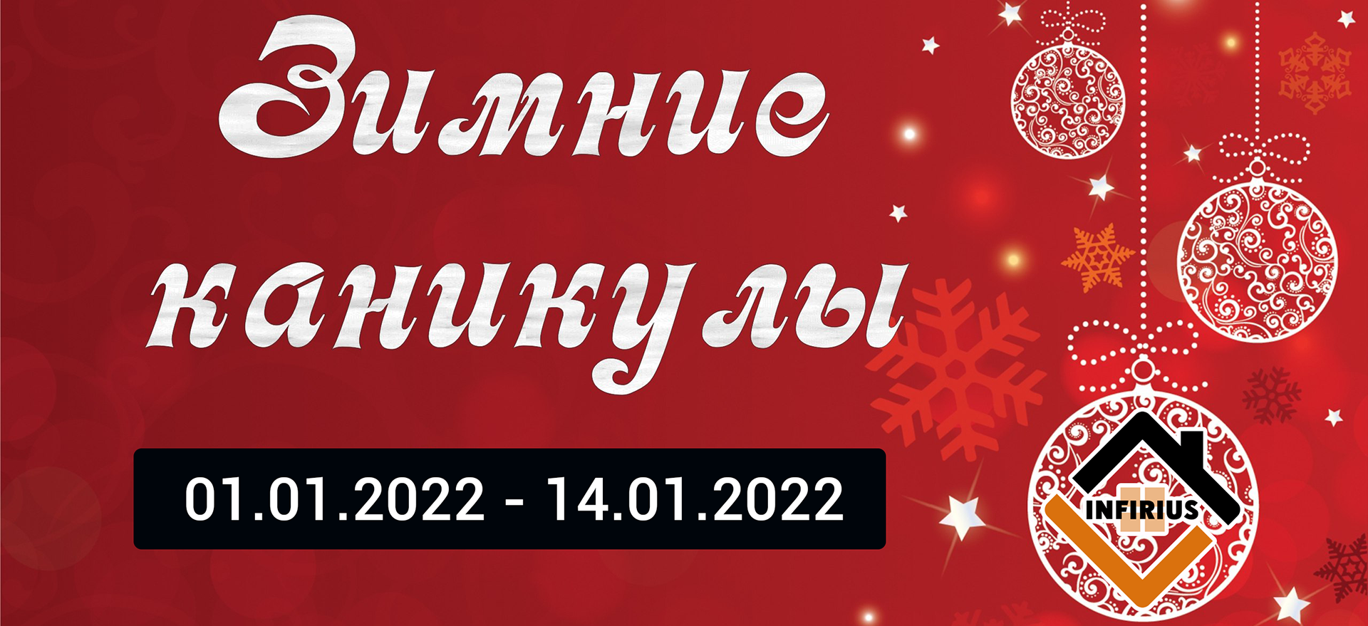 Уважаемые покупатели, доводим до вашего сведения что в период с 01.01.2022 по 14.01.2022 компания “Инфириус” будет на зимних каникулах, соответственно заказы приниматься не будут, а офис продаж будет закрыт для посещения.