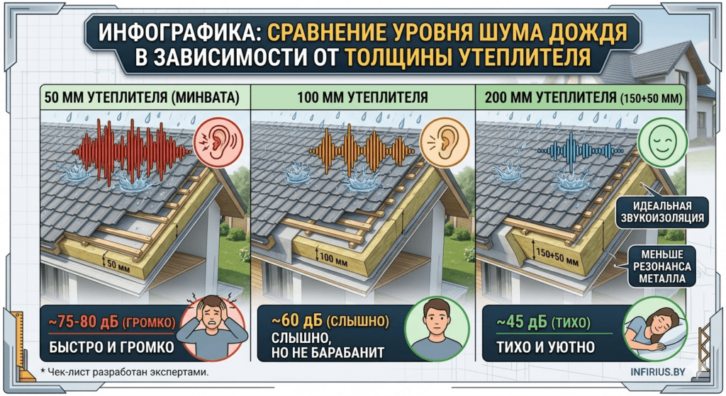 Вердикт от infirius.by: Не бойтесь металла! Хорошо утепленная и грамотно собранная кровля из металлочерепицы по уровню комфорта ничем не уступает бетонным перекрытиям. Главное — доверять монтаж профессионалам и не экономить на начинке.