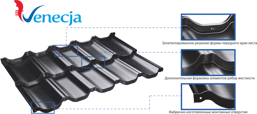 Металлочерепица модели Venecja с покрытиями X-Matt и D-Matt толщиной 35 и 30 микрон.
